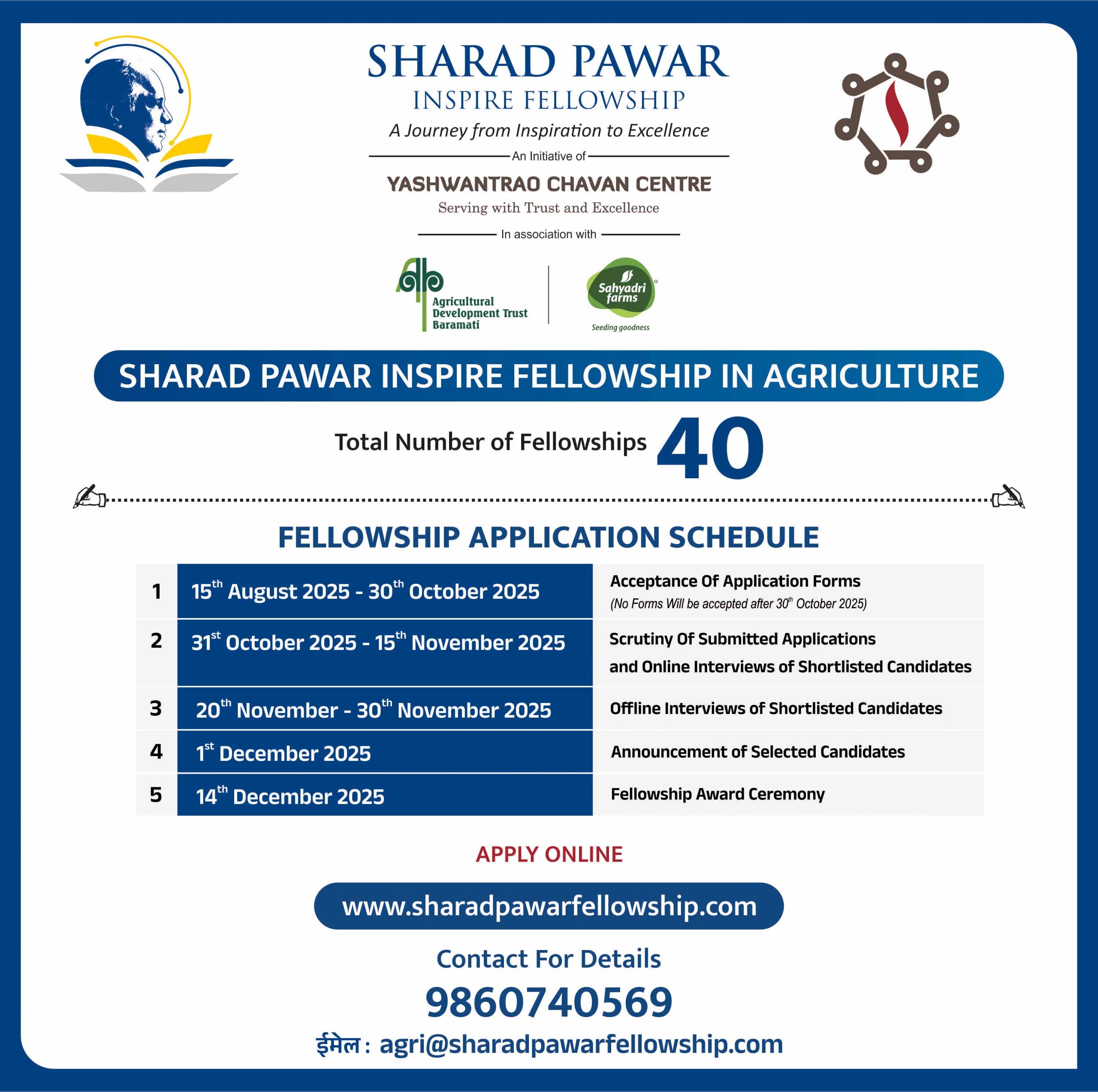 The Sharad Pawar Inspire Fellowship (SPIF) in Agriculture is a flagship initiative by the Yashwantrao Chavan Centre to address farmer distress in Maharashtra through technology-driven innovations.