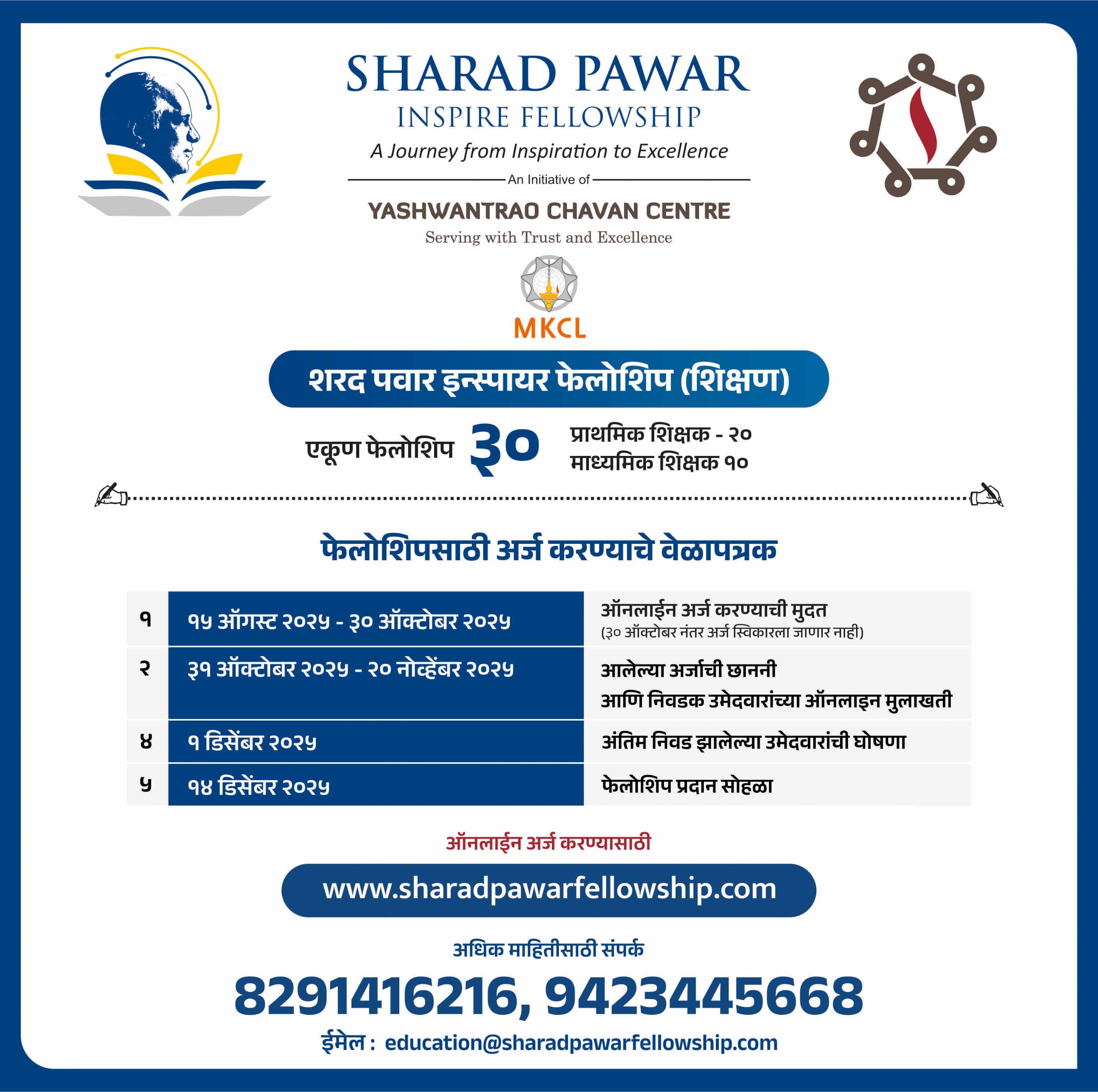 यशवंतराव चव्हाण सेंटर, मुंबई ,शिक्षण विकास मंच यांच्यावतीने यावर्षी शरद पवार इन्स्पायर फेलोशिपसाठी शालेय शिक्षणातील मूल्यांकन प्रक्रियेला केंद्रस्थानी मानून शिक्षकांकडून प्रस्ताव मागविण्यात येत आहेत.या फेलोशिपसाठी आपण निवडलेल्या विषयाच्या माध्यमातून मूल्यांकन प्रक्रियेतील नवोपक्रम पूर्णत्वास जाईल व तो नवोपक्रम इतर शिक्षकांना मार्गदर्शक ठरेल.शरद पवार इन्स्पायर फेलोशिपसाठी शालेय स्तरावरील मूल्यांकन प्रक्रियेच्या विविध पैलूंवर नाविन्यपूर्ण उपक्रमांच्या माध्यमातून मूल्यांकन विषयक प्रकल्पासाठी काम करू इच्छिणाऱ्या शिक्षकांसाठी ही एक पर्वणी असेल.यामधून क्षमताआधारित मूल्यांकन प्रक्रियेच्या विविध पैलूंवर अधिकाधिक परिणामकारक पद्धतीने काम करता येईल.